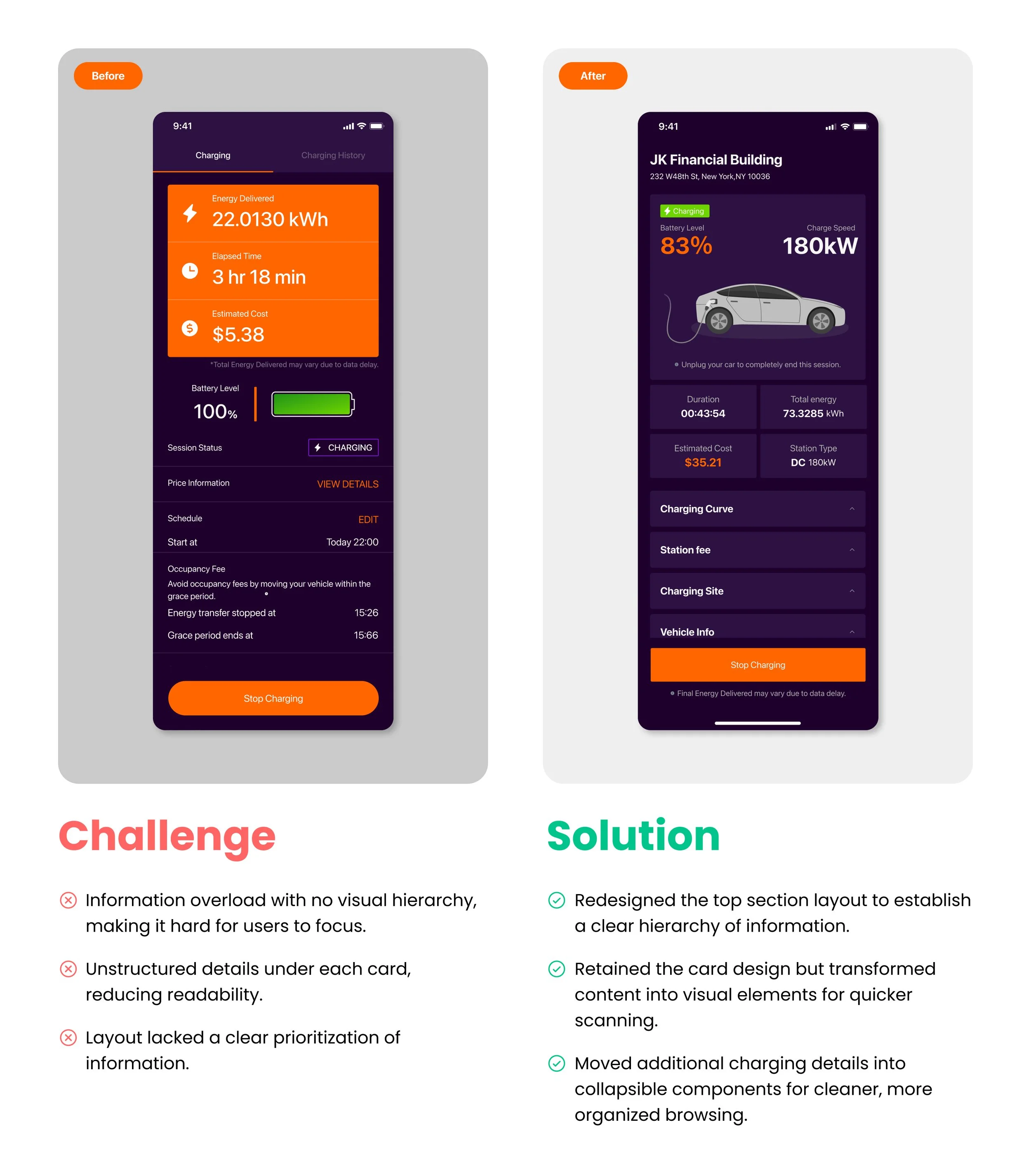 This project focused on enhancing user autonomy and simplifying the charging process. Early UX research revealed unnecessary steps—such as configuring “Plug & Charge”—that disrupted flow. The redesigned process removes these steps, enabling a faster, more intuitive charging experience.